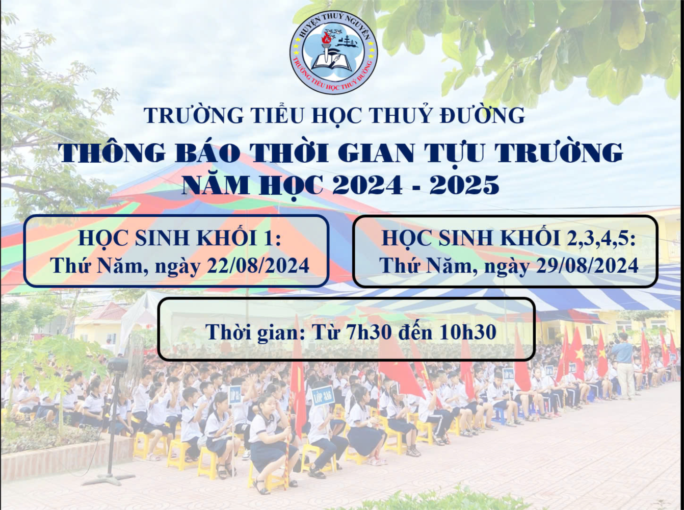Trường TH Thuỷ Đường thông báo thời gian tựu trường của học sinh các khối lớp năm học 2024 - 2025. Cụ thể :