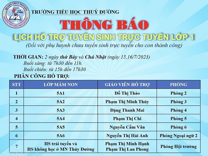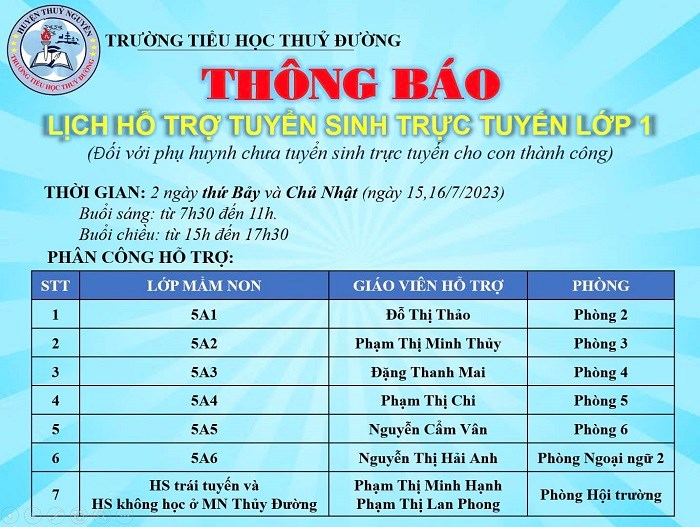 Trường Tiểu học Thuỷ Đường kính gửi tới Phụ huynh học sinh LỊCH HỖ TRỢ TUYỂN SINH TRỰC TUYẾN của Nhà trường.