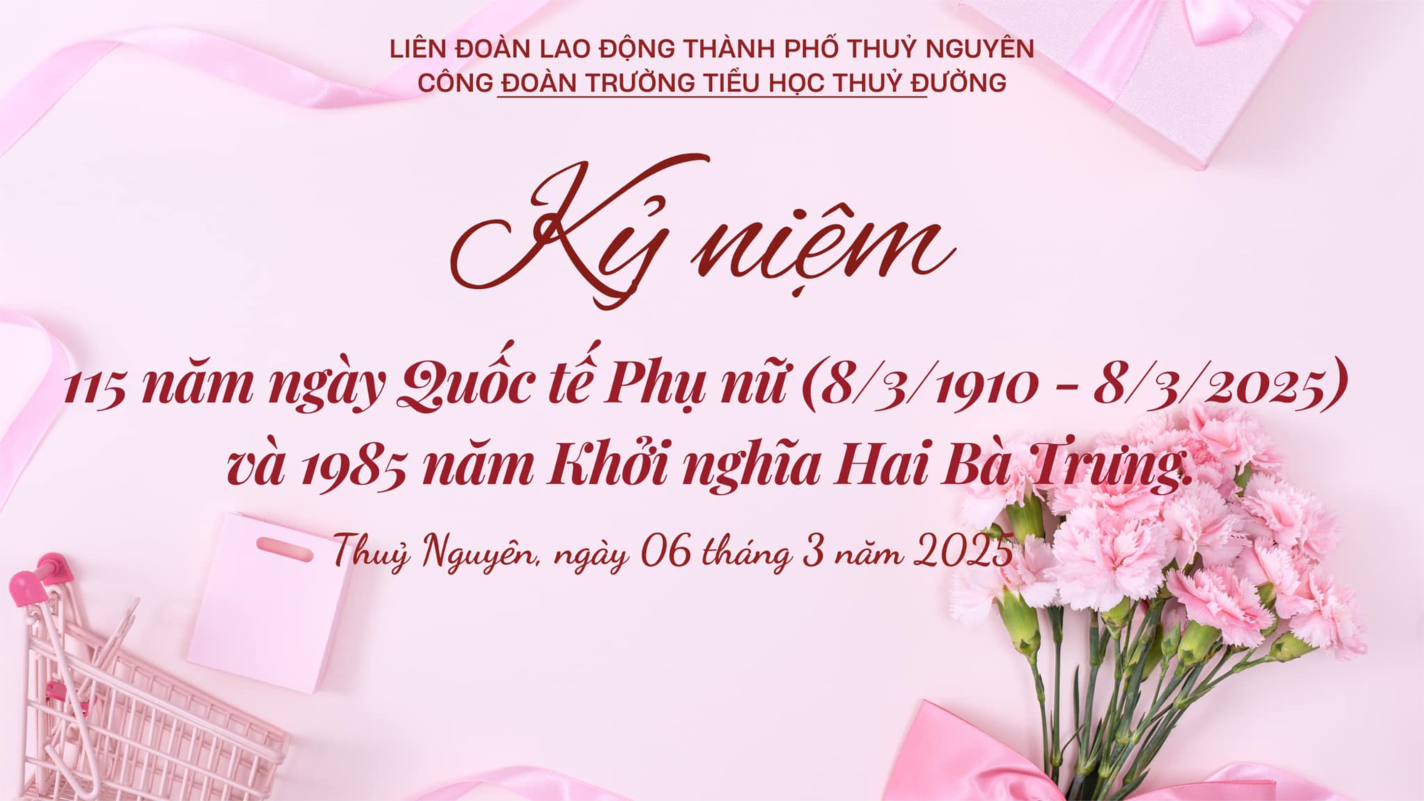 Thực hiện Hướng dẫn của LĐLĐ TP Hải Phòng và LĐLĐ TP Thuỷ Nguyên, Công đoàn trường Tiểu học Thuỷ Đường vui mừng tổ chức kỷ niệm 115 năm Ngày Quốc tế Phụ nữ 8/3 và 1985 năm Khởi nghĩa Hai Bà Trưng. Chương trình kỷ niệm nhằm tôn vinh những người phụ nữ tuyệt vời—những người mẹ, người cô, và những nữ giáo viên tận tâm đã không ngừng cống hiến cho sự nghiệp giáo dục và nuôi dưỡng thế hệ tương lai.