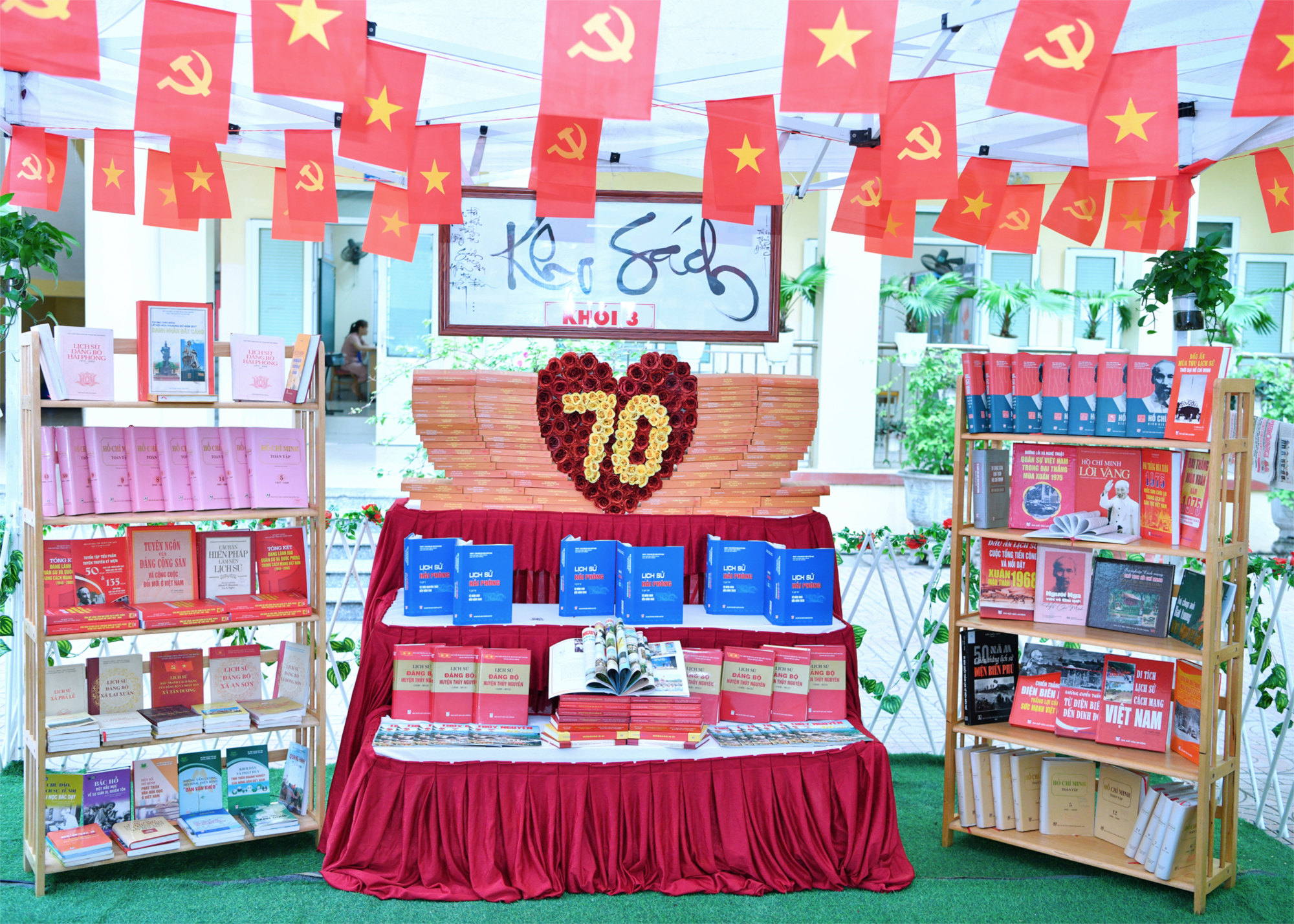 Góc sách khối 3 của Trường Tiểu học Thuỷ Đường tại Ngày hội Đọc sách năm nay đã thực sự gây ấn tượng mạnh mẽ với cách bày trí trang trọng, ý nghĩa, gắn liền với chủ đề kỷ niệm 70 năm niềm tin và khát vọng vươn mình của thành phố Hải Phòng. Nổi bật tại gian trưng bày là mô hình xếp sách tinh tế hình trái tim với con số "70" vàng rực, biểu tượng cho chặng đường 70 năm xây dựng và phát triển. Các đầu sách được sắp xếp khoa học, đa dạng, tập trung vào các mảng sách lịch sử Đảng, tư tưởng Hồ Chí Minh, truyền thống cách mạng, và những dấu ấn vẻ vang của dân tộc.