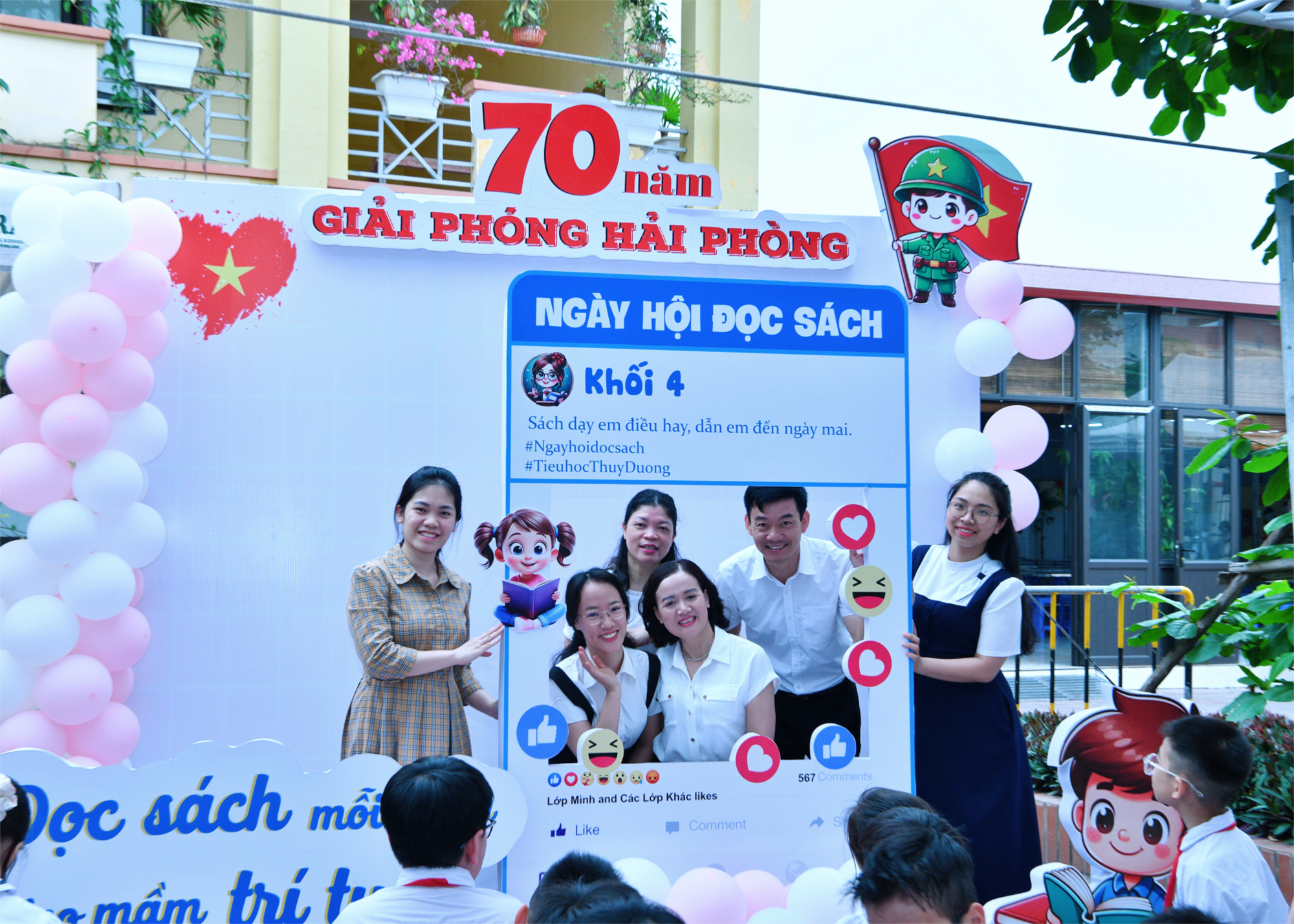 Không gian được trang trí với những tiểu cảnh sinh động: hình ảnh Bác Hồ với thiếu nhi, những bông hoa hướng dương tươi thắm và những chiếc nón lá nhỏ xinh tạo nên nét duyên dáng rất Việt Nam. Đặc biệt, các thầy cô giáo và học sinh khối 4 còn tổ chức hoạt động giao lưu, chụp hình với khung ảnh mô phỏng mạng xã hội, tạo không khí vui tươi, gắn kết và khơi dậy niềm hứng khởi trong phong trào đọc sách.