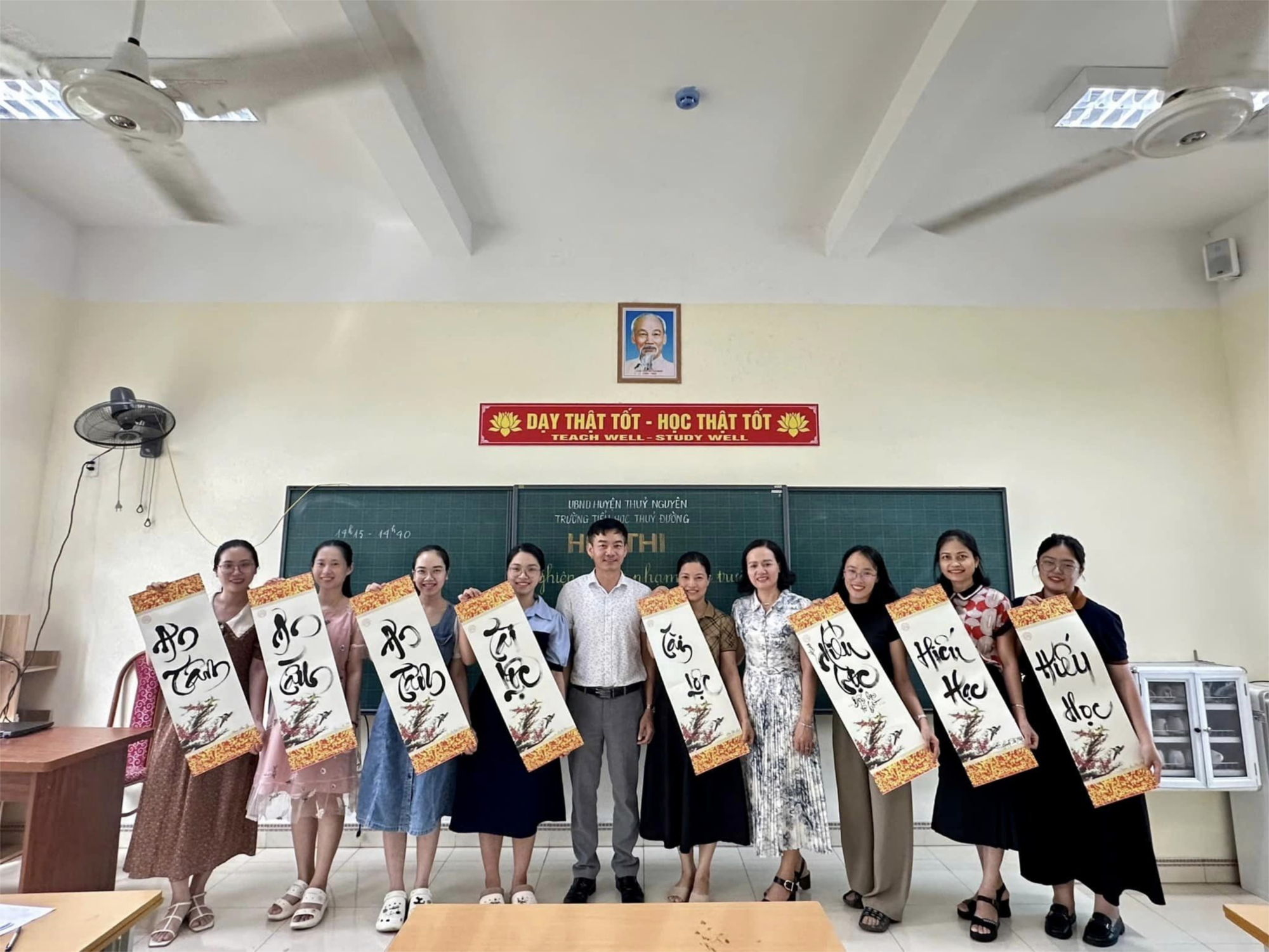 Với mục đích, giúp giáo viên nhà trường có cơ hội thể hiện kỹ năng nghiệp vụ sư phạm, trao đổi kinh nghiệm và học hỏi lẫn nhau trong công tác rèn luyện chữ viết và nghệ thuật viết chữ thư pháp bằng chữ quốc ngữ. Trường TH Thuỷ Đường đã tổ chức Hội thi nghiệp vụ sư phạm cấp trường vào ngày 20/08/2024 với 9 GV có điểm cao nhất từ cuộc thi cấp Tổ.