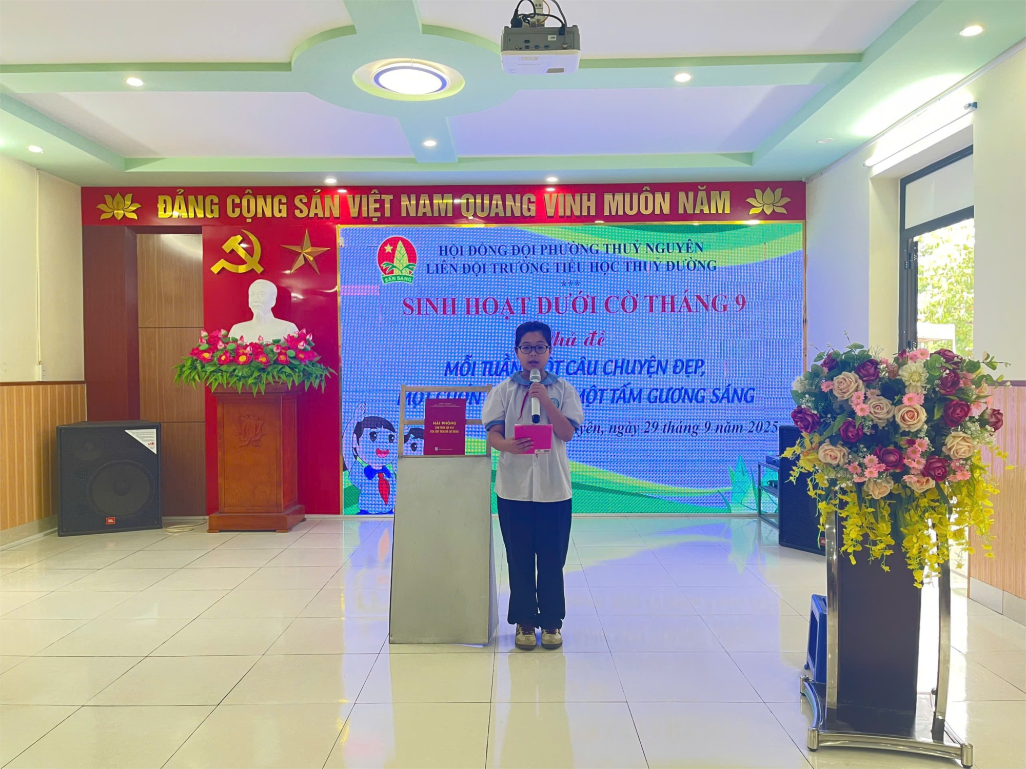 Thực hiện CT Công tác Đội và Phong trào thiếu nhi năm học 2025-2026 của HĐ Đ TP phường Thuỷ Nguyên và Liên đội. Hôm nay, ngày 29 tháng 9 năm 2025 Liên đội TH Thuỷ Đường tổ chức buổi Sinh hoạt dưới cờ tháng 9, chủ điểm "Mỗi tuần một câu chuyện đẹp, một cuốn sách hay, một tấm gương sáng" trực tuyến với sự tham gia đầy đủ của 32 tập thể lớp.